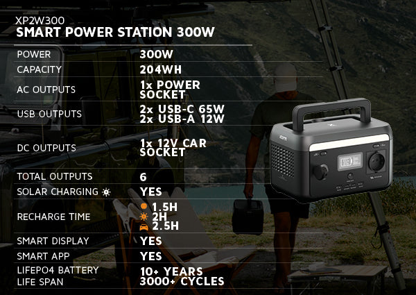 Outputs for all your devices:Portable socket - 1x AC output 300WPower small electrical devices via the 300W AC output. Plug your small cooler, laptop, TV or electric pump into the portable socket and use these devices even in the outdoors. 2x USB-C output 65W Xtorm UltraChargeNo more low-battery anxiety! Easily charge your tablet, smartphone or drone with these fast outputs and stay connected. 2x USB-A output 12W Xtorm FastChargeGive #MoreEnergy to your small mobile devices. Charge your digital camera or headphones and make sure they are always ready to use. 1x 12V car socket 100WCharge devices made specifically for use in cars and motorhomes with this socket. PowerBoost technology for extra powerXtorm PowerBoost technology lets you connect and use devices whose wattage is normally too high for a 300W Power Station. PowerBoost intelligently reduces the voltage while still giving the required power to the device. This allows you to safely connect and use devices with peak power up to 500W. A kettle, for example, still brings water to a boil, it just takes a little longer. Long-lasting and safe LiFePO4 battery cellsThe battery cells in the 300W Power Station have a capacity of 204Wh, a lifespan of 10 years and more than 3000* charge/discharge cycles. These battery cells are co-developed for use in the automotive industry and home energy storage so they meet the highest safety and quality standards. Provide your devices with #MoreEnergy with these safe and reliable batteries wherever you are!Intelligent display keeps you informedThe intelligent display lets you read the 300W Power Station's power output, outgoing wattages and remaining charge time. In addition, you get notifications about too low or too high temperatures and fan status. The manual provides a full overview. Everything under control with the appDownload the ‘Smart Life’ app on your smartphone and control the Power Station via a Wi-Fi connection or Bluetooth. Among other things, you can check battery status and charge times, switch the outputs on and off, set the charge/discharge power time and set timers. This ensures that you have power left over to use in case of emergency or when you are off the grid. More information on installing and using the app, can be found in the manual and at xtorm.eu.Charging in 3 different ways: