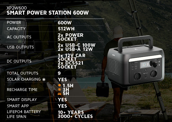 Powerful outputs for all your devices:Portable outlet - 2x AC output 600W combined totalThis Xtorm 600W Power Station has two AC outputs allowing you to easily power electrical devices. Connect your cooler, fan, TV or bike battery and enjoy your devices even in the open air or off-grid. With a total output of 600W, both smaller and larger devices receive #MoreEnergy. 2x USB-C PD output 100W Xtorm UltraChargeGive #MoreEnergy to your USB-C laptop, tablet, smartphone, earbuds or drone. No more low-battery anxiety during the day!2x USB-A output 12W Xtorm FastChargeFor charging small mobile devices. Ensure, for example, that your digital camera and headphones are charged and ready to use. 2x DC5521 output & 1x 12V output (car socket)Some electrical devices are made specifically for use in cars or motorhomes and have a DC or 12V connection. Use one of these outputs to easily charge those devices. Extra power with PowerBoost technologyXtorm PowerBoost technology allows you to connect and run devices whose power demand is normally too high for a 600W Power Station. PowerBoost intelligently reduces voltage while still giving the required power to the device. Devices requiring up to 1000W peak power can be safely connected and used. For example, a hairdryer gets slightly less hot but still dries your hair. Compact and long-lasting LiFePO4 battery cellsThe battery cells in the Power Station were developed partly for use in the automotive industry and energy storage in homes, making them meet the highest safety and quality standards. These batteries have a capacity of 512Wh, a lifespan of 10 years and more than 3000* charge/discharge cycles. A safe and reliable choice to power your devices with #MoreEnergy wherever you are! Intelligent display for full disclosureThe intelligent display tells you exactly how much energy the 600W Power Station has left to give. It shows the battery percentage, output wattages to connected devices and how long it will take to recharge. In addition, you get notifications about too high or too low temperatures and the status of the fan. A full overview of these can be found in the manual. Smart control with the appDownload the ‘Smart Life’ app on your smartphone and control the Power Station via a Wi-Fi connection or Bluetooth. Among other things, you can check battery status and charge times, switch outputs on and off, limit charge/discharge power time and set timers. This ensures that you have power left over to use in case of emergency or when you are off the grid. More information on installing and using the app, can be found in the manual or at xtorm.eu.Charging in 3 different ways:Via solar powerCharge your Power Station by connecting the new 200W Solar panel. A sustainable way to give your Power Station #MoreEnergy while you enjoy the sunshine, even off-grid. No socket or other devices needed and the Power Station is ready to use again after about 3 hours. The previous generation Xtorm solar panels can be connected with the added DC7909 to MC4 adapter cable.Via wall socketThe fastest way to charge your 600W Power Station is to use the AC charging cable. You connect the Power Station to a wall socket and recharge it fully in about 2 hours. While drivingAnother way to give your Power Station #MoreEnergy is while driving. Connect the car charging cable and within 5 hours the Power Station is fully charged again. Xtorm stands for quality and reliabilityXtorm gives you the best quality, latest tech and most safety for years of #MoreEnergy! We have been working on outdoor products and sustainable devices since 2008. The 600W Power Station has built-in safety features such as auto-power management, overload protection and an advanced cooling system. With the 6-layer Xtorm safety check, both the Power Station and connected devices are protected against short circuits, overcharging and overheating, among others. Guaranteed safe #MoreEnergy, for years! *One battery cycle is a full charge/discharge from 0 to 100%. This can also be divided over several, smaller charges.